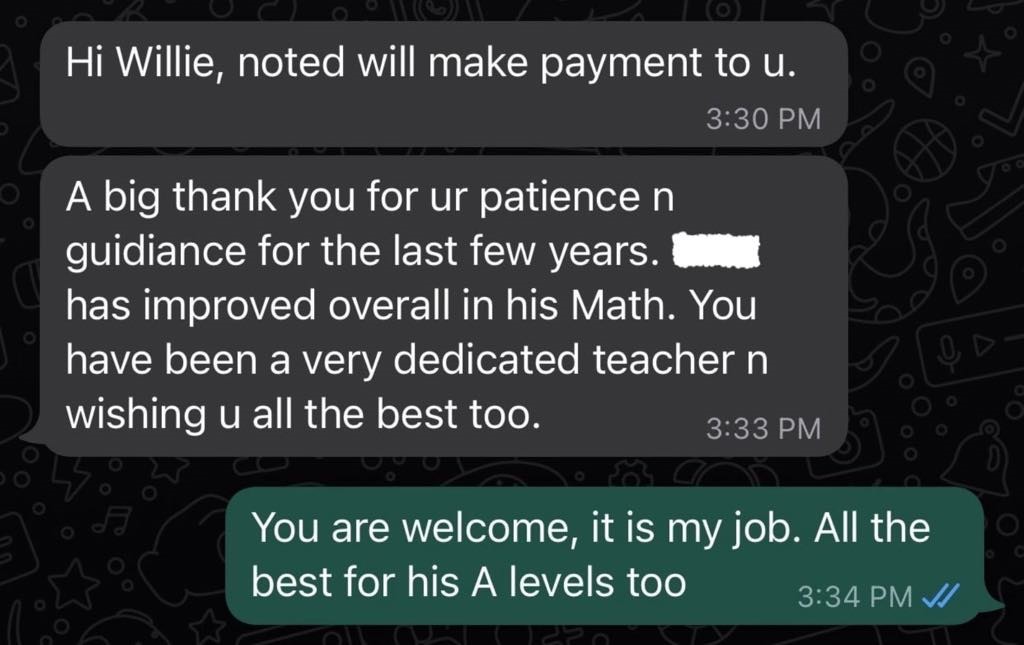 “Dr Willie is very understanding and helpful. He will always address our misconceptions in a brief yet comprehensible manner before we proceed to learning new concepts. He also made us feel at ease, by patiently explaining and simplifying difficult concepts to us. I hope that Dr Willie receives recognition for his effort and passion towards teaching the module, as he’s inspiring me to be a better math teacher in the future.”