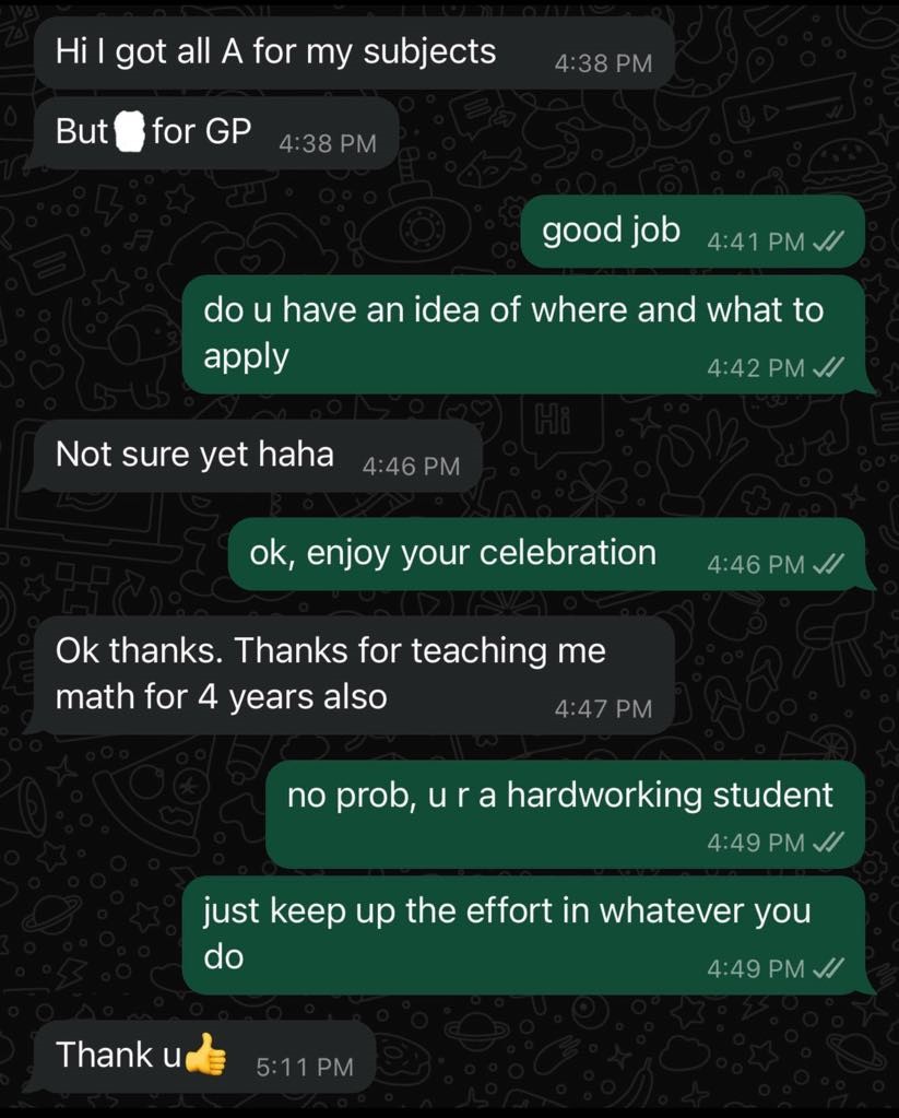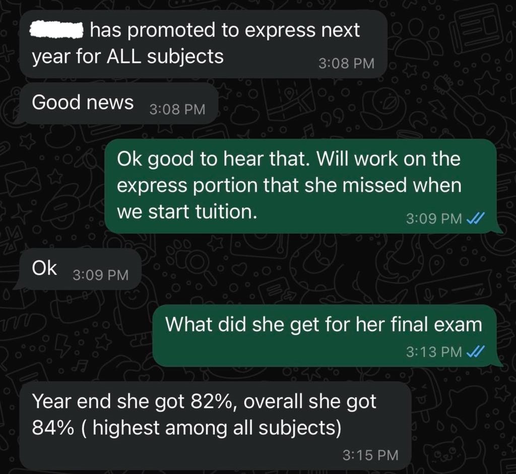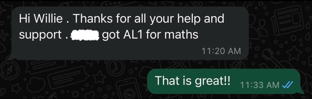 “The trainer explain the question in details and would use all kinds of methods to teach us till we understand. Top notch learning from the trainer. Would recommend him to teach maths and other subjects he is good in as he is able to let me understand the topic he is teaching. Patient trainer.”